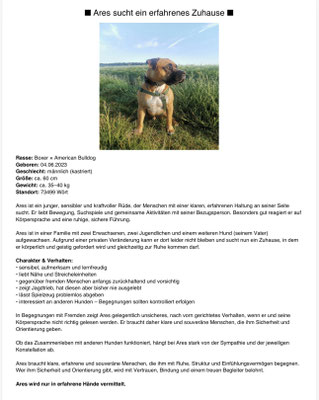 Um möglichst vielen Tieren den Aufenthalt im Tierheim zu ersparen, unterstützen wir Privatvermittlungen. Die Angaben in den folgenden Steckbriefen sind Aussagen der Besitzer.